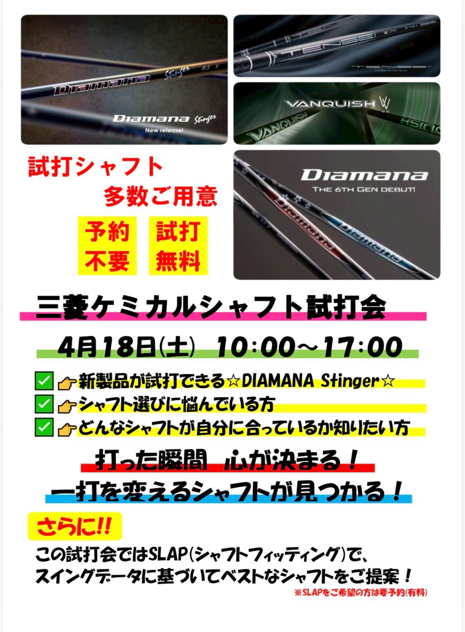 HOME > お知らせ > 2026/03/15|4月18日開催 三菱ケミカル試打会のご案内 2026年3月15日 2026年3月17日 4月10日(金)、三菱ケミカルより「ディアマナスティンガー」が発売されます。 ピンときた方はキャリアの長い方かと(^^) ツアーでの評価も高く早速投入しているプロも。 紹介記事はこちら ということで、4月18日(土)東川口ゴルフラボにて、三菱ケミカル試打会を行います。 是非お時間作ってお越しください。 Twitter Share Pocket Hatena LINE コピーする
